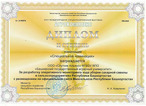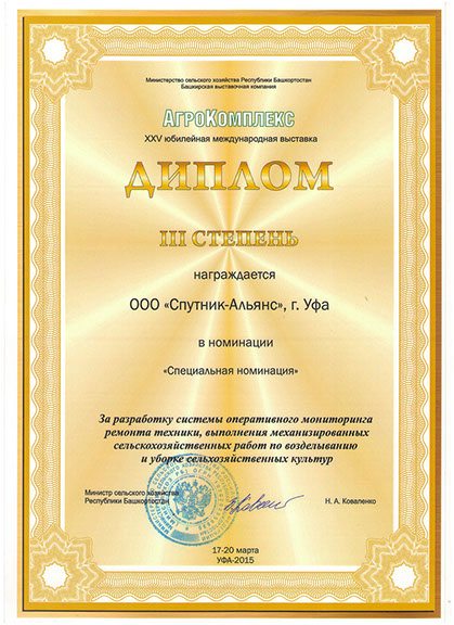 С информационного портала Минсельхоза РБ был организован открытый доступ к системам мониторинга. Работа удостоена серебряных медалей Международных выставок и «Агрокомплекс – 2014» (г.Уфа) и «Золотая осень - 2014» (г. Москва).